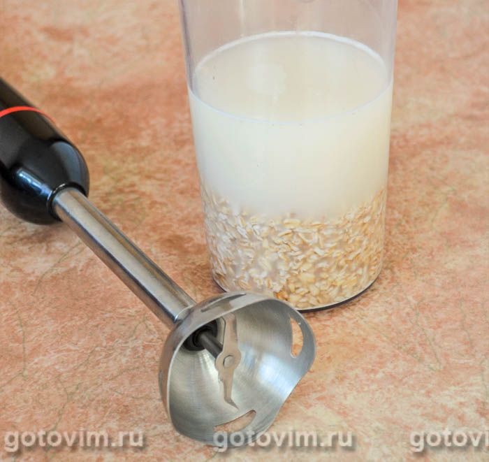 Разбухшие хлопья вместе с водой переливаем в чашу блендера и измельчаем погружным блендером несколько минут.