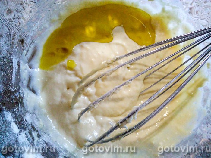 Следом вливаем оливковое масло (можно взять подсолнечное или растопить сливочное), взбиваем. Высыпаем оставшуюся муку. Взбиваем. Добавляем соду пищевую, перемешиваем и даём постоять тесту для панкейков 10 минут.
