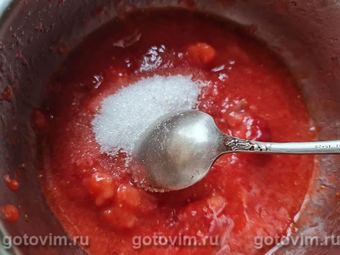 В это время перебрать клубнику и пюрировать блендером. Перелить клубничное пюре в ковшик, добавить сахар по вкусу и прогреть на слабом огне, размешивая, пока не растворится сахар.