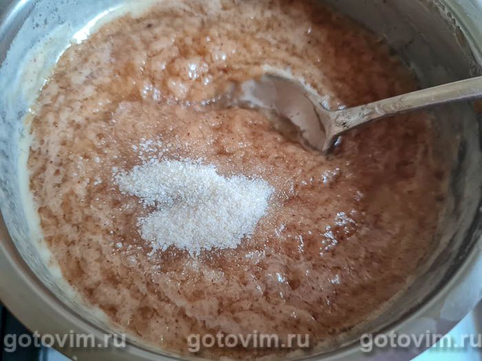 Засыпать в ковш с ореховой массой порошковый желатин, тщательно размешать.