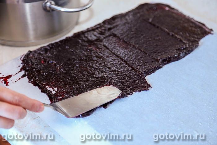 Противень (или любую другую подходящую поверхности) застелить пекарской бумагой и вылить ягодное пюре. Разровнять лопаткой, чтобы слой был не больше 2-3 мм.