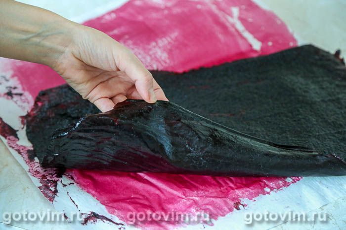 Дальше — сушка. Я сушила при комнатной температуре. На это ушло несколько дней. Если есть возможность сушить на солнце, то накрыть пастилу марлей и оставить сушиться на солнце. Как вариант, поставить противень в тёплую духовку и наблюдать, как быстро пастила высохнет.