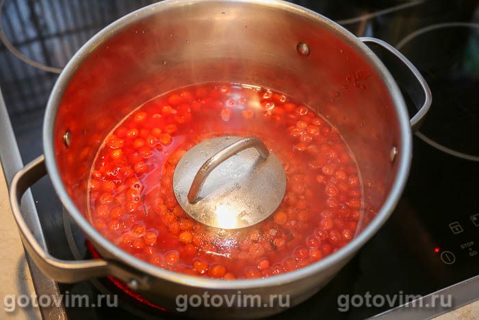 Калину собрать после первых заморозков. Чуть подмерзшие ягоды отделить от кистей, перебрать, оставив только здоровые. Промыть ягоды в миске с водой, откинуть на дуршлаг и дождаться, чтобы вода с ягод стекла почти полностью. Подготовленные таким образом ягоды пересыпать в кастрюлю, прикрыть плоской крышкой или тарелкой и подержать кастрюлю с ягодами на слабом огне, пока ягоды не начнут лопаться. Снять кастрюлю с калиной с плиты.