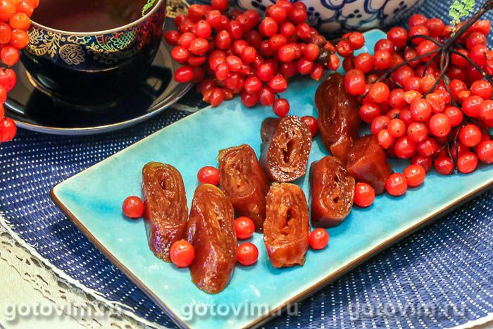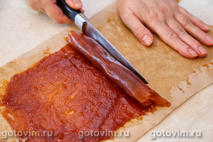 Поставить лоток/противень с пастилой в духовку, прогретую до 70С, в режим конвекция. Сушить пастилу в духовке с чуть приоткрытой дверцей примерно 4 часа. За это время пастила должна хорошо подсохнуть. Поддеть край пастилы и потянуть его вверх. Продолжать так тянуть и скручивать пастилу из калины в трубочку. Для удобства подачи десерта нарезать пастилу отрезками примерно по 3 см. Готовую пастилу из калины с апельсином хранить в холодильнике, чтобы она хорошо сохраняла форму.