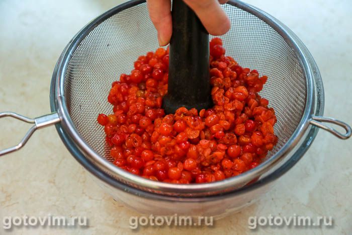 Когда ягоды немного остынут, откинуть их на металлическое сито, под которое поставить миску. Протереть ягоды толкушкой или пестиком.