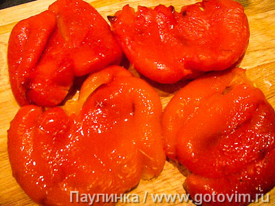 Запечь перцы в духовке на решетке. Сразу же, горячими положить в полиэтиленовый пакет, немного подождать, вытащить, убрать хвостики и семена, очистить от кожицы.