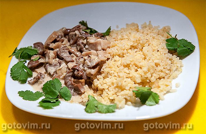 Смешать со второй половиной припущенного лука, сливками, мукой и отдельно варить, взбив блендером. Потом обратно смешиваем и еще на полчасика на рассекатель это дело. Готовые почки с грибами и подливкой на тарелке с булгуром.