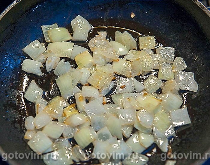 Нарезанный крупно лук (половину) обжарить.