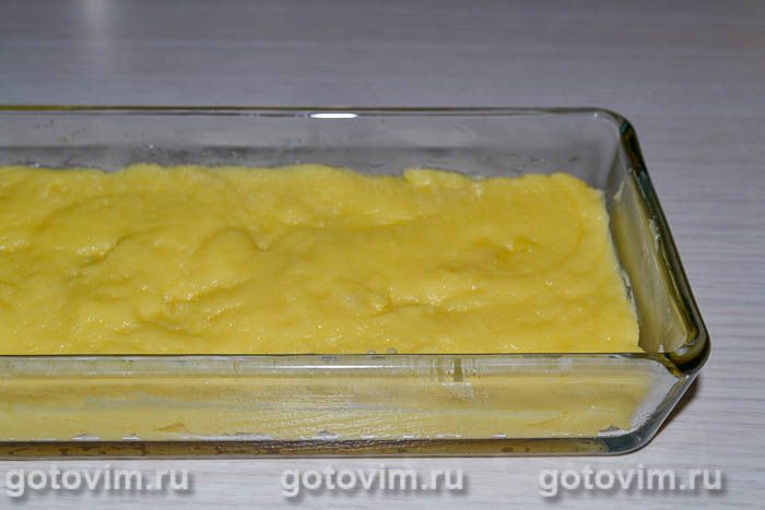 Готовую кукурузную кашу переложите в невысокий контейнер. Верх разровняйте силиконовой лопаткой и поставьте в холодильник для застывания.
