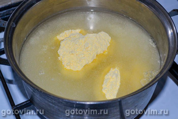 Для приготовления поленты сварите густую кашу из кукурузной муки. Для этого сначала отмерьте 200 мл кукурузной муки и 400 мл холодной воды. Влейте воду в кастрюльку и включите плиту. Сразу же засыпьте муку в холодную воду и венчиком хорошо размешайте во избежание образования комочков. Всыпьте соль.