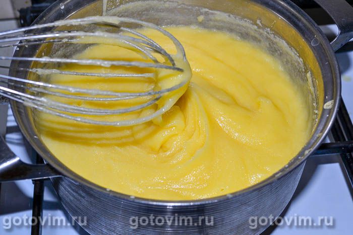 На небольшом огне варите при постоянном помешивании кукурузную кашу. Когда каша начнет густеть, и ее будет неудобно размешивать венчиком, возьмите деревянную лопатку с ровным краем. Варите поленту, не переставая ее энергично размешивать и соскабливать со дна кастрюли, чтобы каша не пригорела. Полента приготовится приблизительно за 30-35 минут.