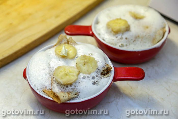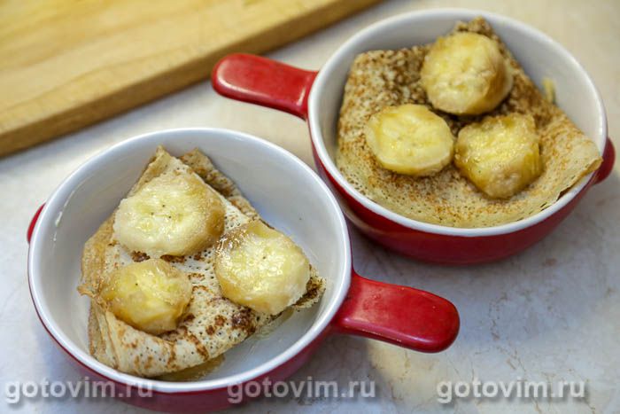 Дождитесь, чтобы яйца пропеклись и превратились в суфле, а бананы немного подрумянились. Запеканка из блинов с бананами готова. Можно подавать на стол сразу, пока горячая. Но и когда запеканка остынет, вкус остается таким же замечательным. Приятного аппетита!