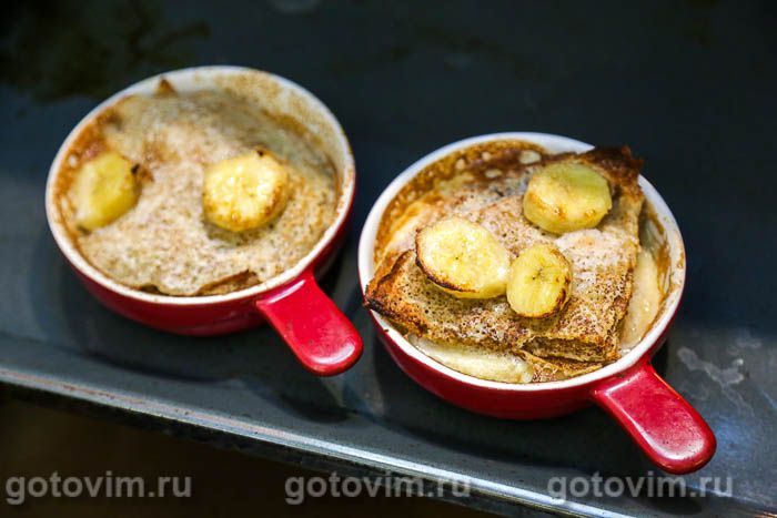 Украсить верх блинной запеканки бананами и отправить в разогретую до 180С духовку на 10-15 минут.