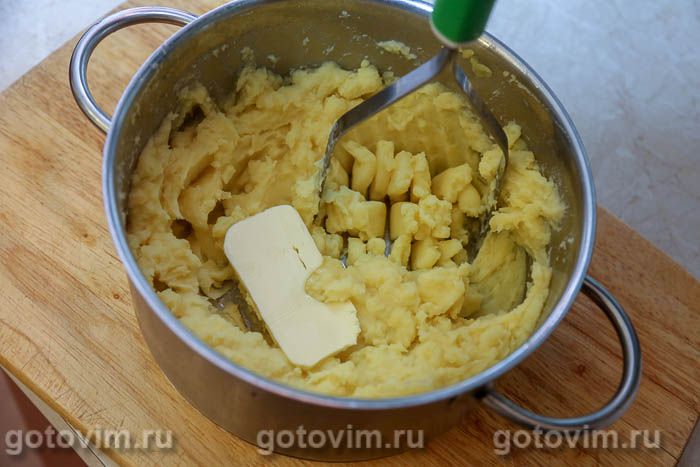Размять картофель в пюре, подливая теплое молоко. Молока можно добавить и больше, ориентируйтесь на свой вкус. Положить в кастрюлю сливочное масло.