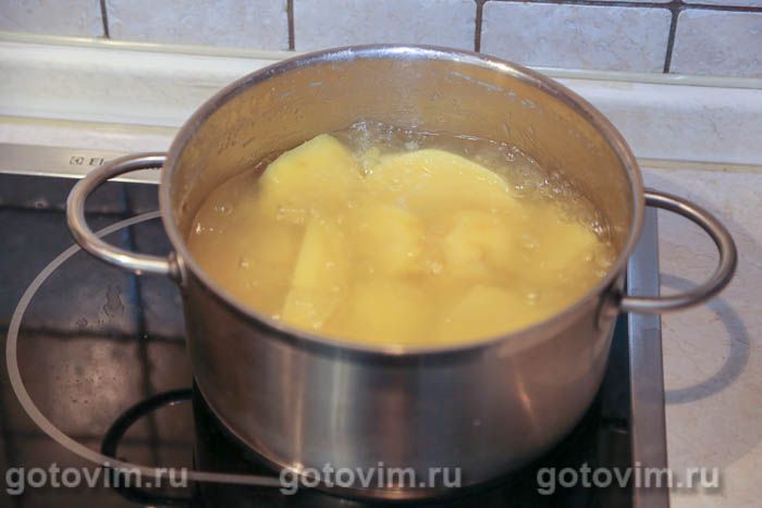 Картофель очистить, если клубни крупные — разрезать пополам. Вскипятить воду, посолить, положить картофель и варить на небольшом огне под крышкой до полной готовности. Слить с вареного картофеля отвар.