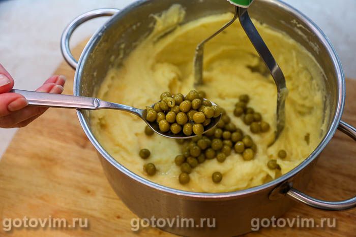 Пробуем рецепт картофельного пюре с добавлением консервированного горошка. Есть вариант, когда горошек мнут и в таком виде примешивают к пюре. Но можно просто добавить целые горошины, чтобы картофельное пюре не потеряла свой аппетитный кремовый цвет.