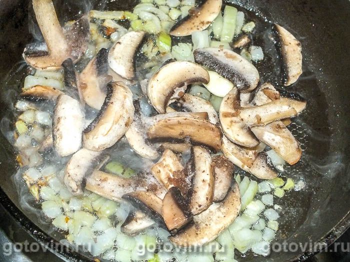 Обжариваем на сковороде лук и чеснок, затем добавляем грибы, пряности и соль. Грибы подойдут любые, я использую шампиньоны.