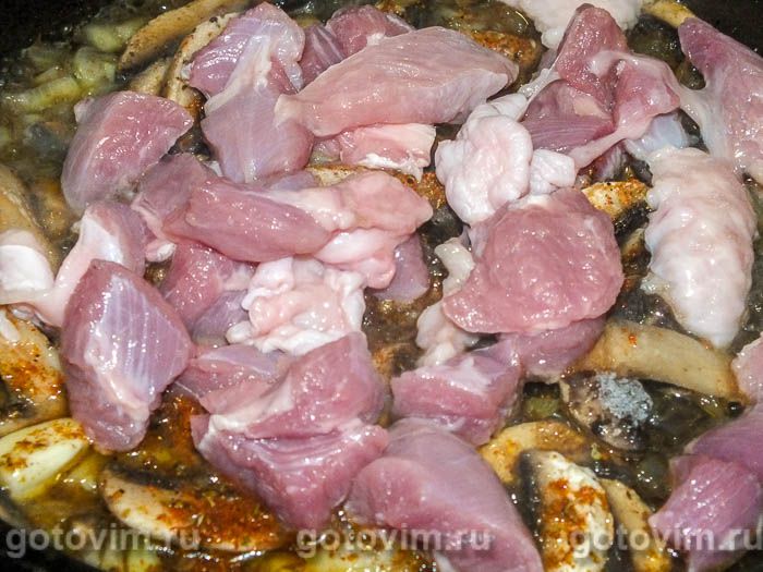 Добавляем к грибам мясо, нарезанное небольшими кусочками. Для приготовления блюда подойдет любой вид мяса, у меня был небольшой кусочек индейки.