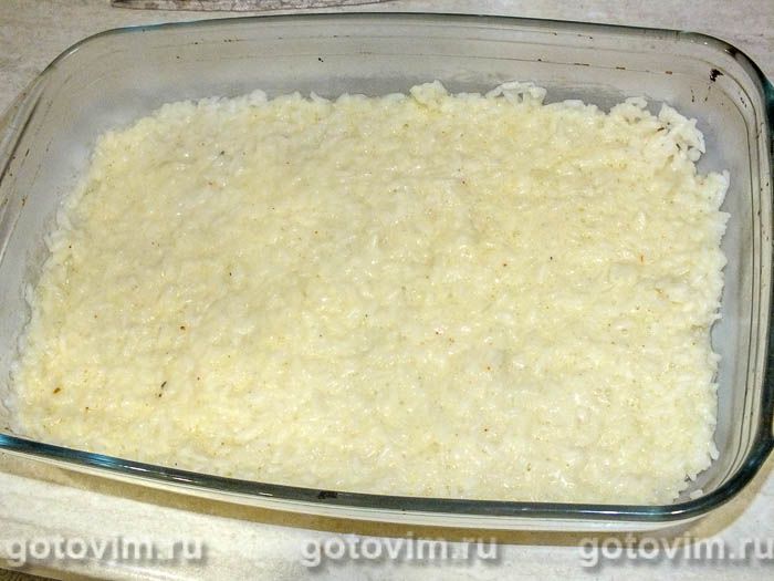 Выкладываем рис в форму для запекания.