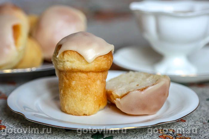 По желанию готовые ромовые бабы полить глазурью. Для приготовления глазури на минимальном огне растопить в сотейнике сливочное масло, добавить молоко и сразу всыпать всю сахарную пудру. Держать на огне, постоянно перемешивая, пока масса будет похожа на крем. Снять с огня, добавить ванильную эссенцию и тщательно перемешать.