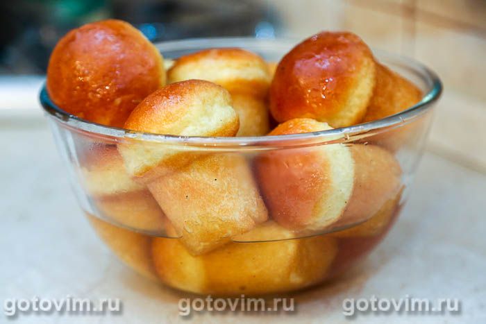 Готовые бабы переложить в миску и залить теплым сиропом. Бабы должны полностью им пропитаться! Руками вылавливать баб из сиропа, смело отжать их, потому что тесто легко восстанавливает свою форму. Важно, чтобы и сироп, и бабы были если не горячие (руки обожжете), то уверенно теплые.
