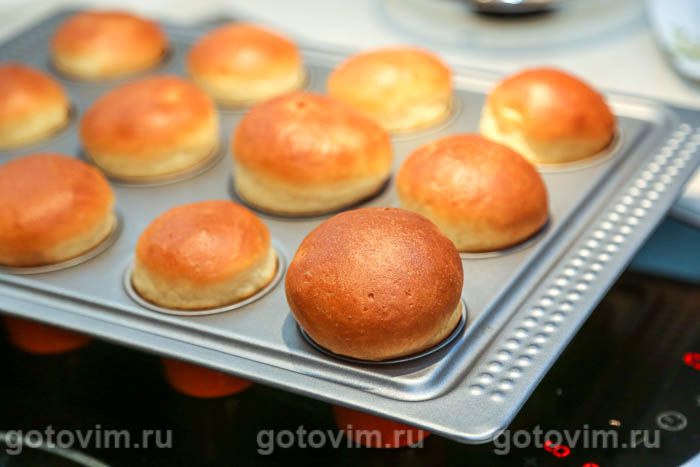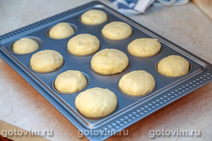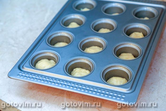 Подошедшее тесто разложить в смазанные маслом формочки для кексов. Форму надо заполнять на 1/2 формы. Накрыть пленкой и ждать, пока тесто поднимется и появится округлая шапочка.