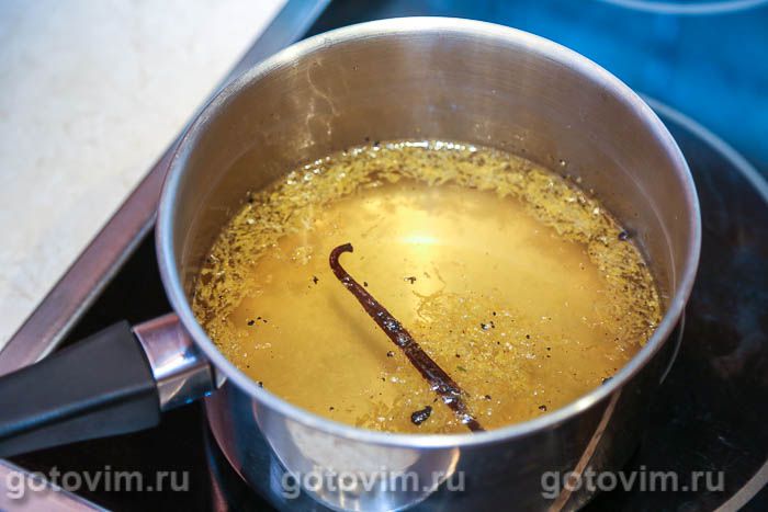 Пока тесто в духовке, приготовить сахарный сироп с добавлением палочки ванили и лимонной цедры. Варить на очень слабом огне, не кипятить и не мешать. Сироп процедить, дать остыть примерно на 60С и влить ром.