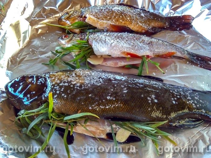 Через полчаса решётку с рыбой можно снимать с огня. Чтобы убедиться в готовности блюда, развернём фольгу: глазки у линя белые, значит, можно есть смело, он хорошо запёкся. Приятного аппетита!