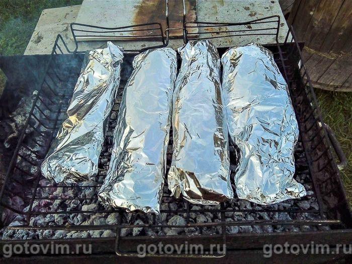 Каждую рыбку, кроме линя на крючок попался золотистый карась и плотвичка, завернём в два слоя фольги. Уложим рыбные тушки на решетку и поставим над углями. Не будем зажимать тушки второй решёткой, чтобы не вытекал сок. Учтите, рыбу придётся периодически переворачивать, поэтому лучше надеть рукавицы, дабы не обжечься.