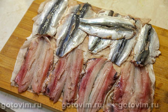 Тонким ножом поддеть косточки, подрезать позвоночник и потянуть за хвостик. Сделать у тушки надрезы в районе головы и убрать её вместе с позвоночником.