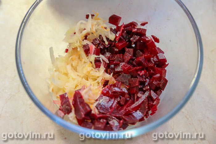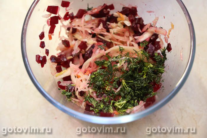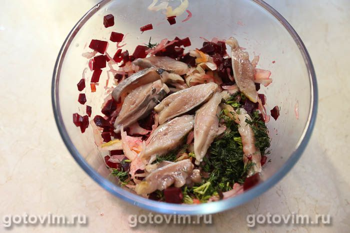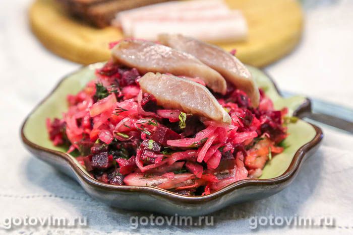 Салат из квашеной капусты с соленой сельдью напоминает винегрет с рыбой, но готовится проще, быстрее и из меньшего количества ингредиентов. Его можно подавать как самостоятельное блюдо или вместе с картофельным пюре. Свеклу для салата желательно запечь в фольге, чтобы вкус был более яркий.