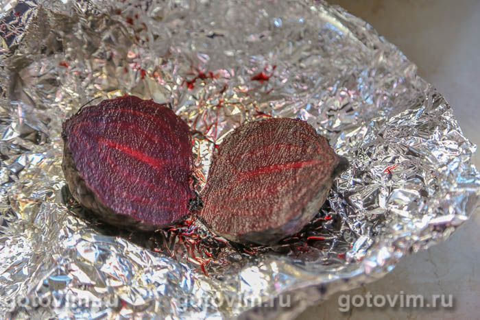 Свеклу вымыть, обернуть фольгой, уложить на противень и запекать в духовке при 200С примерно 40 минут. Проверить готовность свеклы, проткнув ножом. Если она пропеклась, то очистить и нарезать маленькими кубиками.