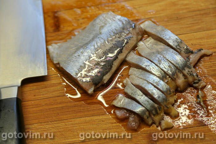 Филе солёной сельди нарезать кусочками шириной около 2 см.