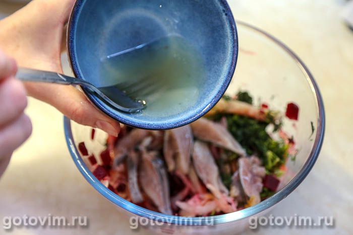 Приготовить салатную заправку: в небольшой миске смешать масло, уксус, горчицу. Заправить салат получившимся соусом,перемешать и можно подавать на стол. Салат из квашеной капусты со свеклой и соленой сельдью готов. Приятного аппетита!
