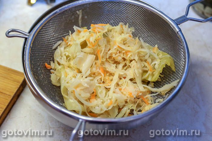 Квашеную капусту отжать, а если она окажется слишком кислой, то сначала промыть под проточной холодной водой, откинуть на дуршлаг и хорошо отжать. Подготовленную капусту переложить в салатник и посыпать сахаром, перемешать.