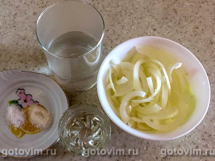 Замариновать лук. Репчатый лук очистить, нашинковать тонкими полукольцами, добавить по половине чайной ложки сахара и соли, залить двумя столовыми ложками уксуса и 100 мл кипятка. Дать время настояться, пока отвариваются желудочки.