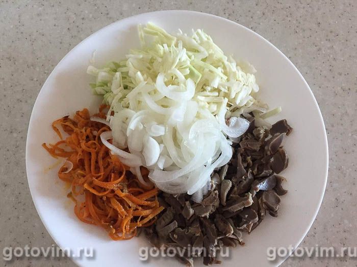 Перед подачей салата все перемешать, используя для заправки растительное масло или майонез. Салат из куриных желудочков с корейской морковкой и капустой готов. Приятного аппетита!
