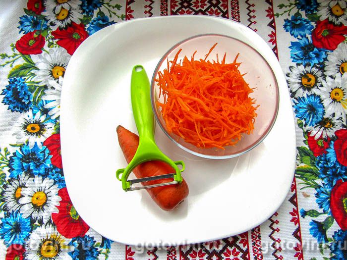 Свежую морковь моем, очищаем и измельчаем на специальной терке соломкой.