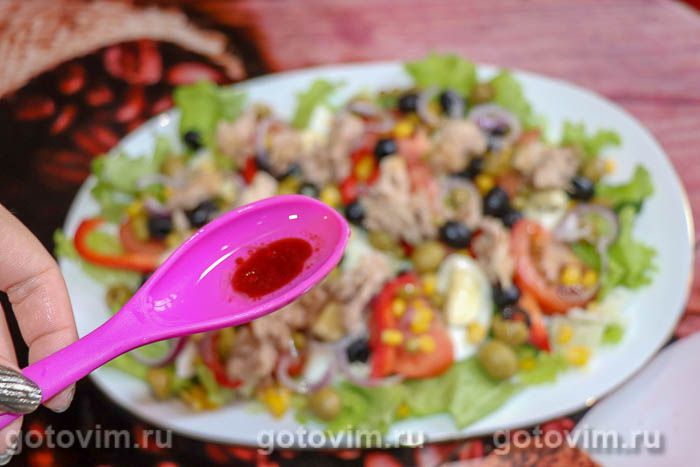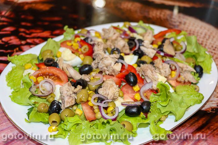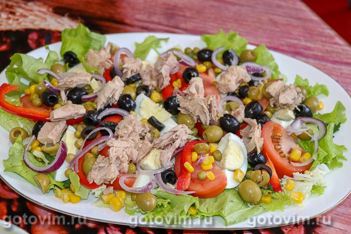 Кусочки тунца выложить на тарелку к остальным ингредиентам в произвольном порядке.