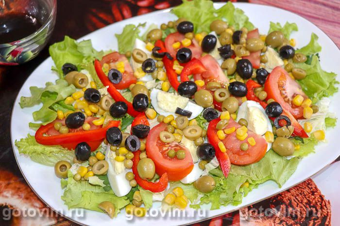Этот салат подойдет для тех, кто любит легкие и вкусные закуски без майонеза. Он чем-то похож на «Греческий» и «Нисуаз» одновременно, но все же состав ингредиентов несколько другой. Рецепт простой, поэтому на приготовление уйдет совсем не много времени, особенно если ингредиенты подготовить заранее.