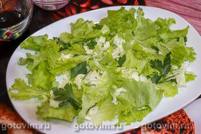 Взять тарелку с плоским дном. Листья салат вымыть, обсушить на бумажном полотенце, подготовленную зелень порвать руками. Вложить зеленый салат на тарелку.