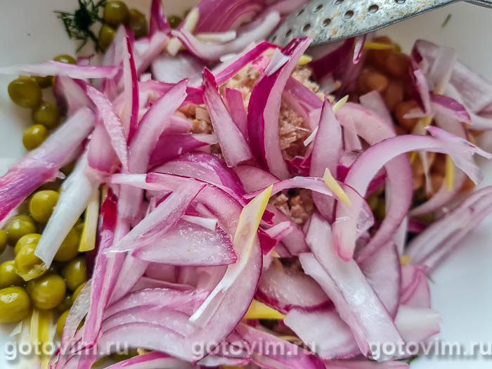 Консервированный тунец отлично сочетается с бобовыми. Пример тому, разнообразие салатов из фасоли и зеленого горошка с добавлением тунца в масле или в собственном соку. Для остроты в такие салаты добавляют салатный лук (красный или белый). Перед подачей на стол в рыбный салат приправляют растительным маслом или майонезом.