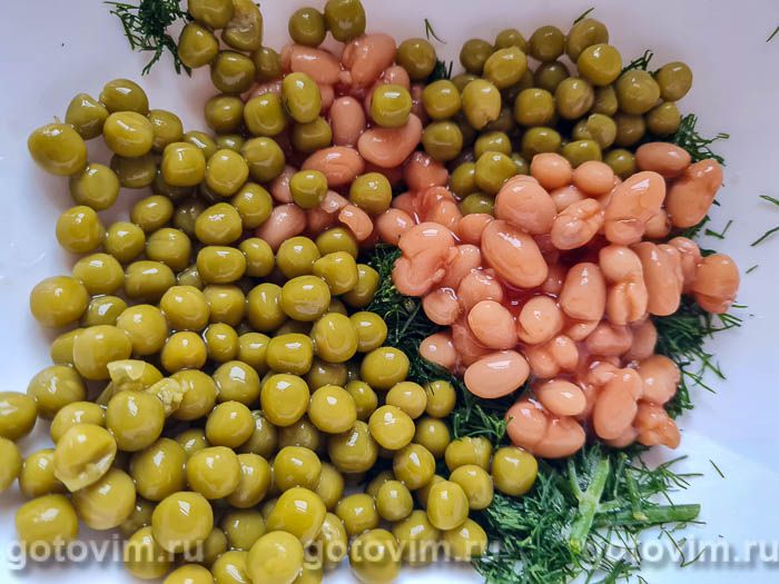 В салатник выложить фасоль и зеленый горошек. Бобовые подойдут и консервированные и вареные. Посыпать мелко нарезанной свежей зеленью.