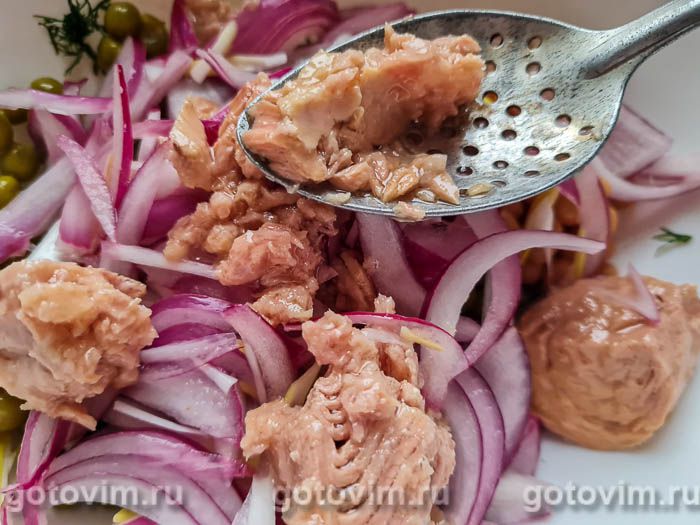 С консервированного тунца слить масло или сок. Крупные кусочки рыбы размять вилкой, разодрать на волокна. Переложить консервированного тунца в салатник к остальным ингредиентам. Приправить по вкусу солью и молотым черным перцем. Для заправки подойдет растительное масло или майонез. Салат из консервированного тунца с фасолью и зеленым горошком готов. Приятного аппетита!