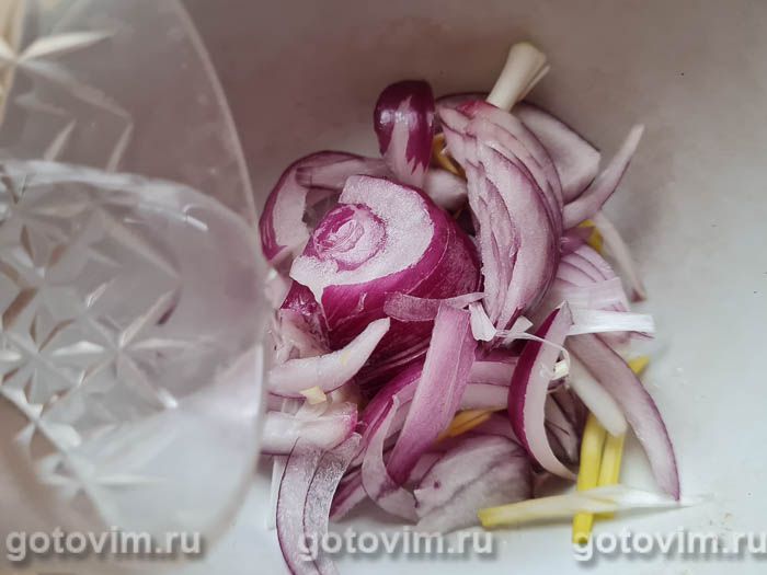 Сладкий салатный лук (крымский предпочтительнее) нарезать полукольцами и залить подкисленной уксусом водой. Оставить на 15-20 минут, чтобы убрать остроту. Затем откинуть на дуршлаг, чтобы стекла вода.