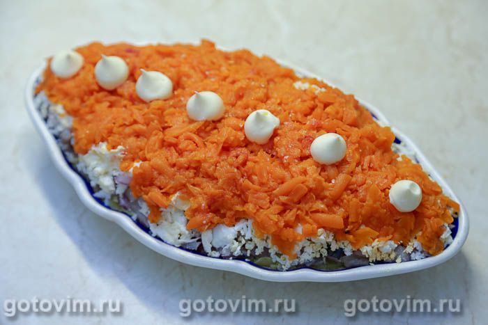 На яичный слой распределить морковь, чуть смазать майонезом.