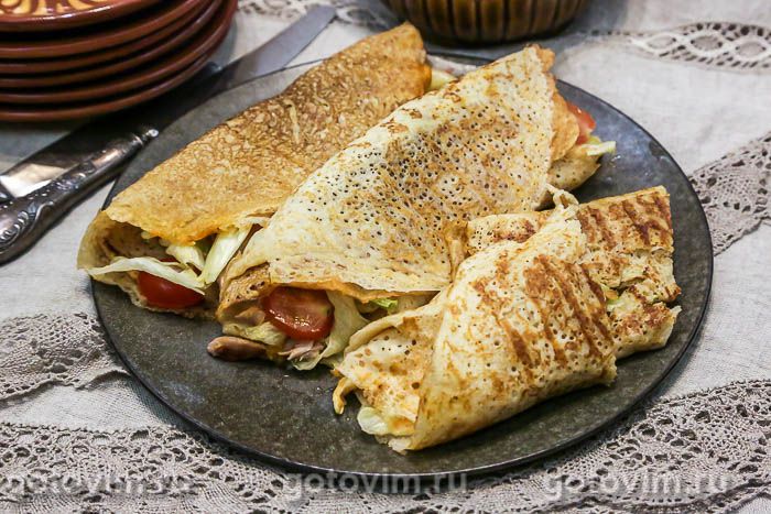 Отличие шаурмы из блина от блинов с начинкой — только в подаче. Края блина собирают к центру над начинкой из запеченной куриной грудки с овощами, а затем отправляют на сковороду швом вниз, чтобы блин слегка прижарился. Получается вкусно, да и готовить проще простого. Пробуем?