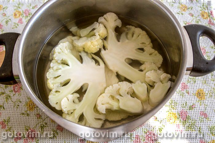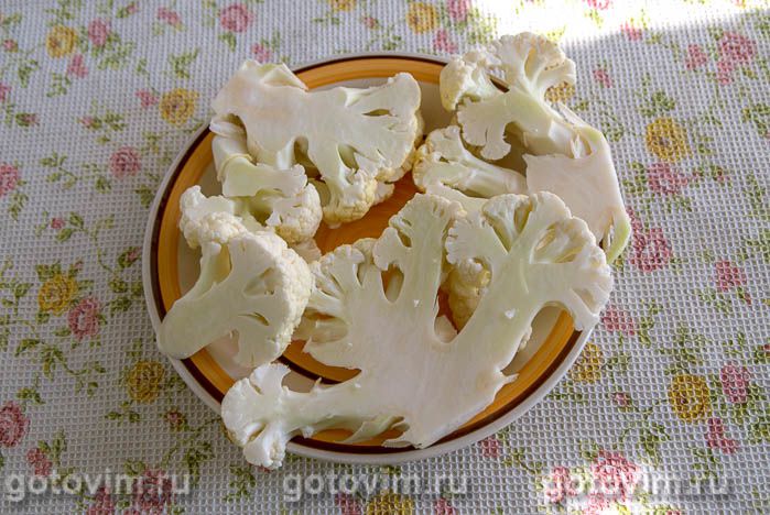 Цветную капусту нарезаем пластинами толщиной около 1 см. Стараемся отобрать только целые кусочки капусты, а отдельные соцветия используем для других блюд.