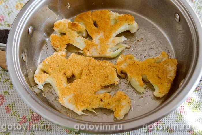 Выкладываем заготовку на сотейник, предварительно прогрев на нем масло. Снижаем температуру, ждем несколько минут и переворачиваем стейк из цветной капусты на другую сторону. После того, как шницель из цветной капусты покроется хрустящей корочкой и приобретет золотистый оттенок, перекладываем его на блюдо и подаем с любым соусом по вкусу.