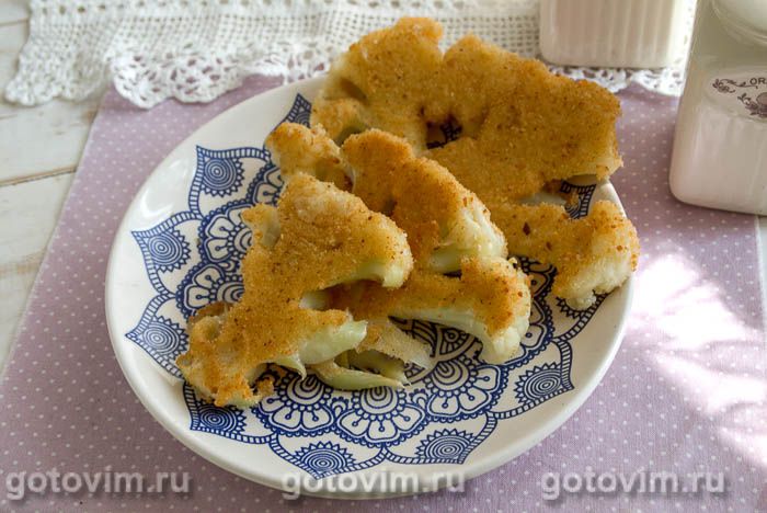 Такой шницель — отличный вариант для полноценного обеда или ужина, к которому не нужен никакой гарнир. Разве что можно добавить соус по вкусу, например, чесночный или йогуртовый. Благодаря тому, в рецепте не используются яйца и животный жир, блюдо доступно веганам и постящимся. Для шницеля выбирайте капусту среднего размера около 1 кг, т.к. в рецепте используется только «серединка» плода, возле кочерыжки, потому что именно она позволяет соцветиям держать форму при тепловой обработке. Остальную часть цветной капусты вы можете использовать для приготовления других блюд или заморозить впрок.